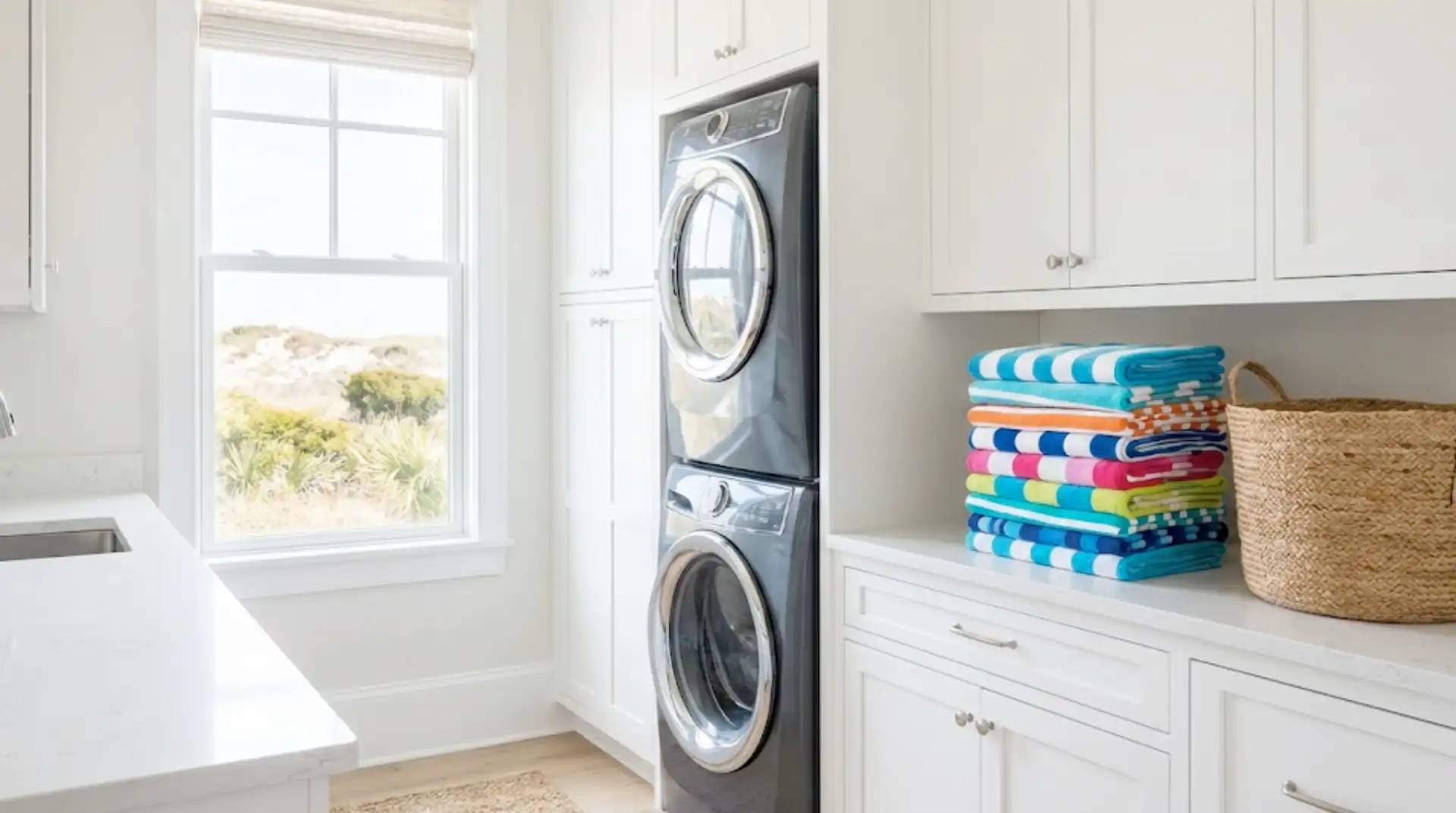 Modern laundry room with stacked washer and dryer and folded beach towels in a Wild Dunes beach house.